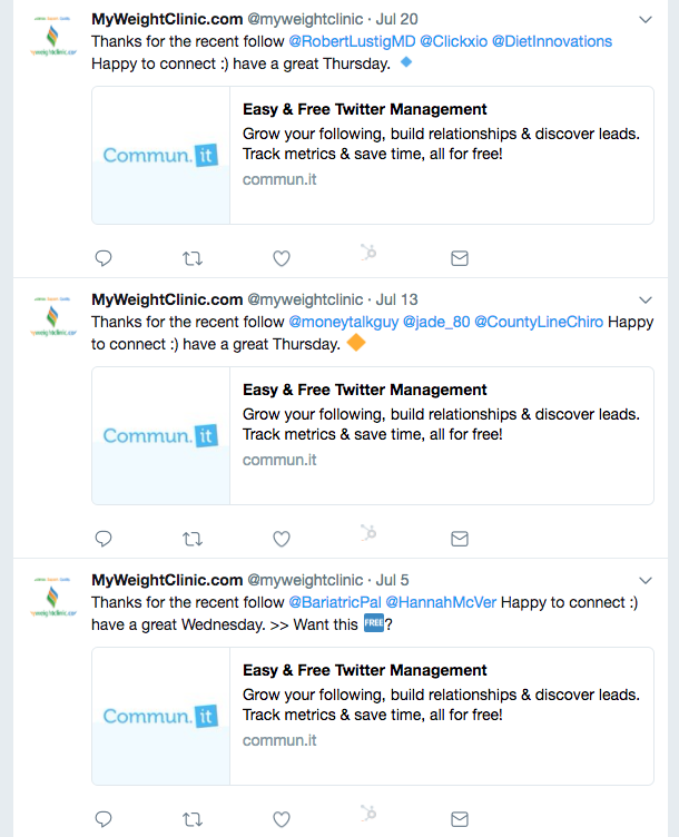 Sometimes automating your social posts is not the best way to engage users! This account’s Twitter feed features generic messages and ultimately lacks variety, steering visitors away from their page.