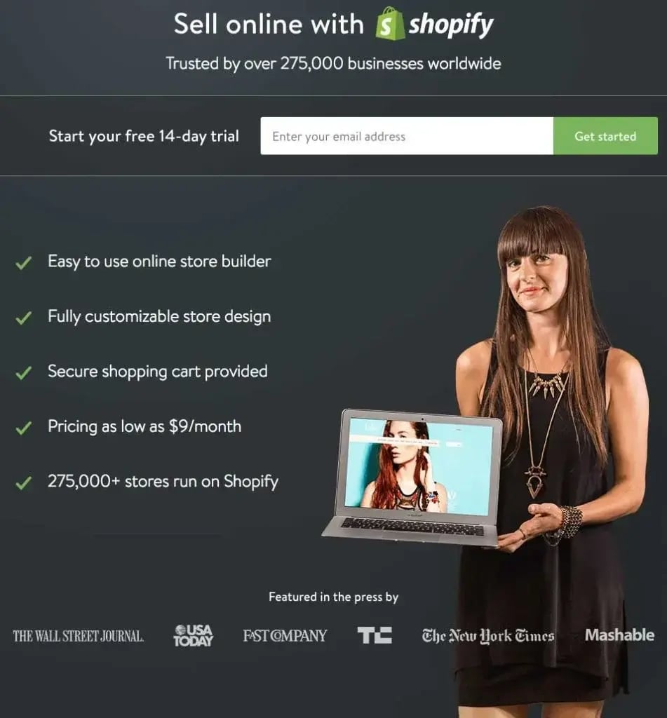 Shopify shows landing page visitors their authority with their current number of users and a “featured in the press” section, not to mention a simple checklist.