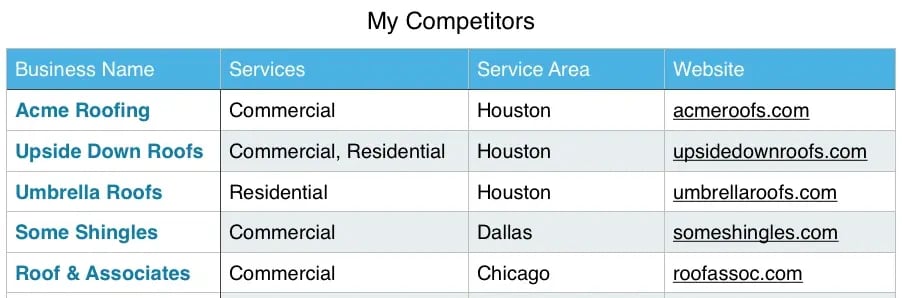 Begin by listing out the local competitors – we’re guessing you already know who these guys are – then expand your list with similar businesses that are only just outside your service area. For example, are you based in Houston? Try searching for Dallas companies. This will help you by keeping your research to a similar geographical region.