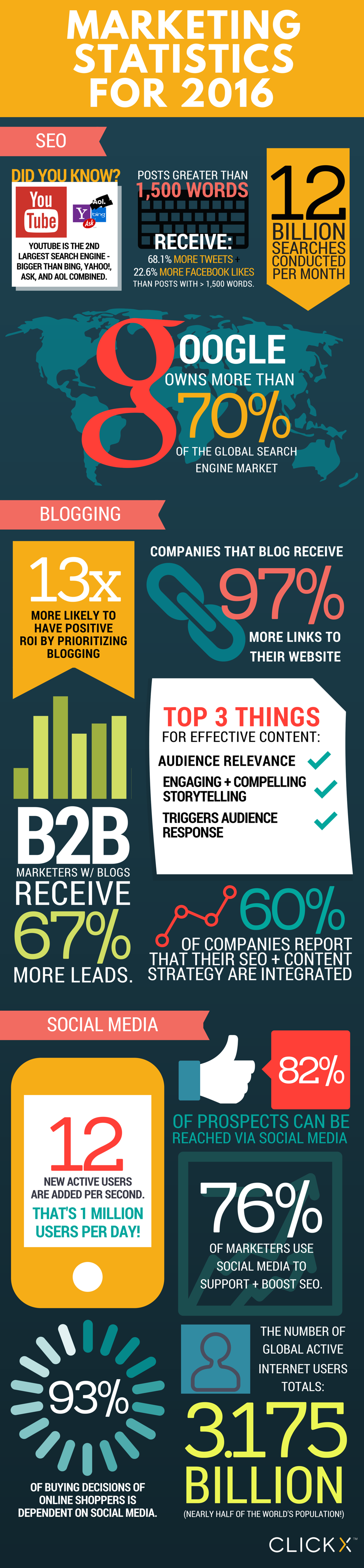Search engine optimization is perhaps the quickest evolving part of online marketing. Currently, Google reigns supreme in the search engine game with more than 70 percent of traffic. However, content marketing has changed the rules of the game. Longer posts—those reaching 1,500 words or more—get more views than shorter blogs. Don’t let the post length scare you away: Companies that blog still get 97 percent more links to their website. All of these elements work together to bolster your online marketing presence.
